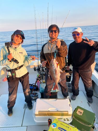 タイラバジギングにて出船 ジギング好調です。黒潮の影響でハガツオ、ネリゴ入れ喰い連発久しぶりに船上がお祭り騒ぎになりました。また、真鯛や沖アジなども釣れています。